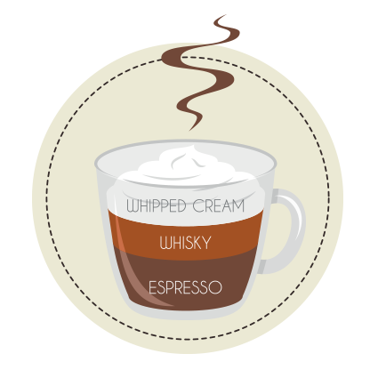Irish coffee consists of black coffee, whiskey and sugar, topped with whipped cream.